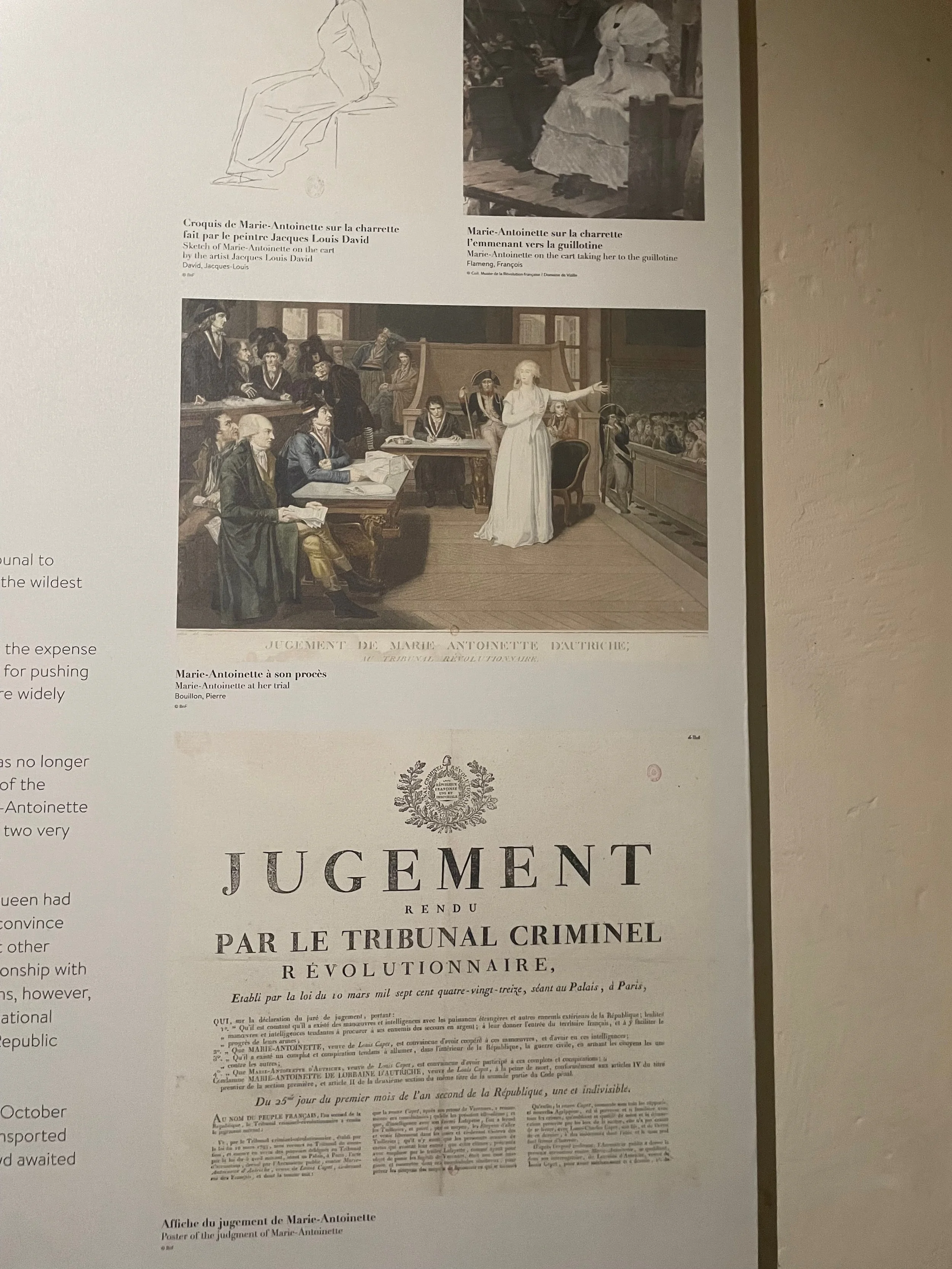 On voit des tableaux de Marie-Antoinette emprisonnée puis emmenée à l’échafaud. Attaquée dans sa dignité, meurtrie par un acharnement du peuple, elle était loin de ressembler à ce qu'elle était aux temps idylliques du Petit Trianon à Versailles. Ses traits sont ceux de la terreur et du cauchemar.