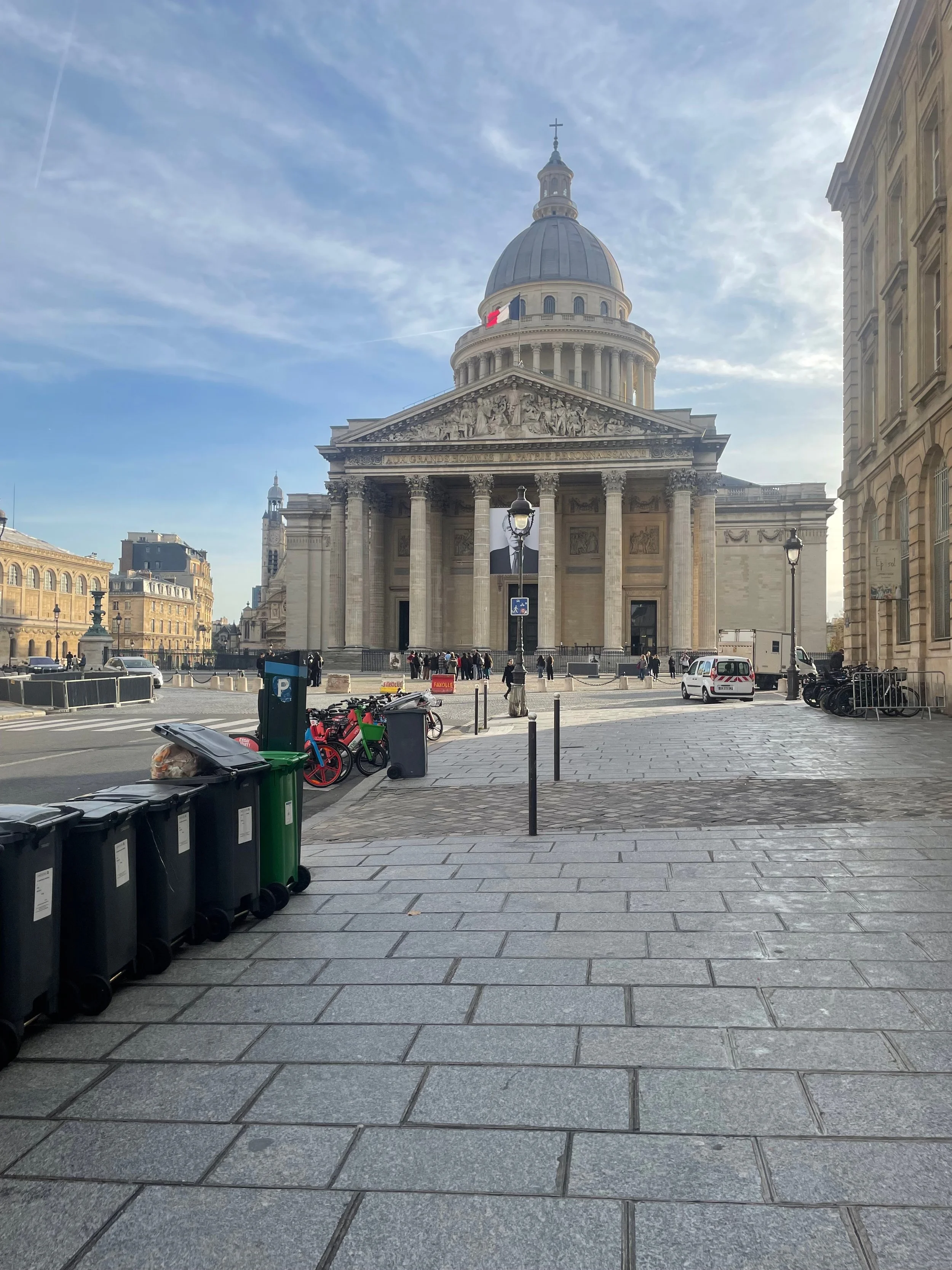Le Panthéon par la rue Soufflot, près du jardin du Luxembourg est spectaculaire, à mi-chemin entre un temple grec et une cathédrale. Il a pour but de rendre hommage aux grands hommes et à la Mémoire de la Nation : « Aux grands hommes, la patrie reconnaissante ». À sa cime flotte les couleurs de la France et sur son fronton est le portrait de Robert Badinter, homme politique français.