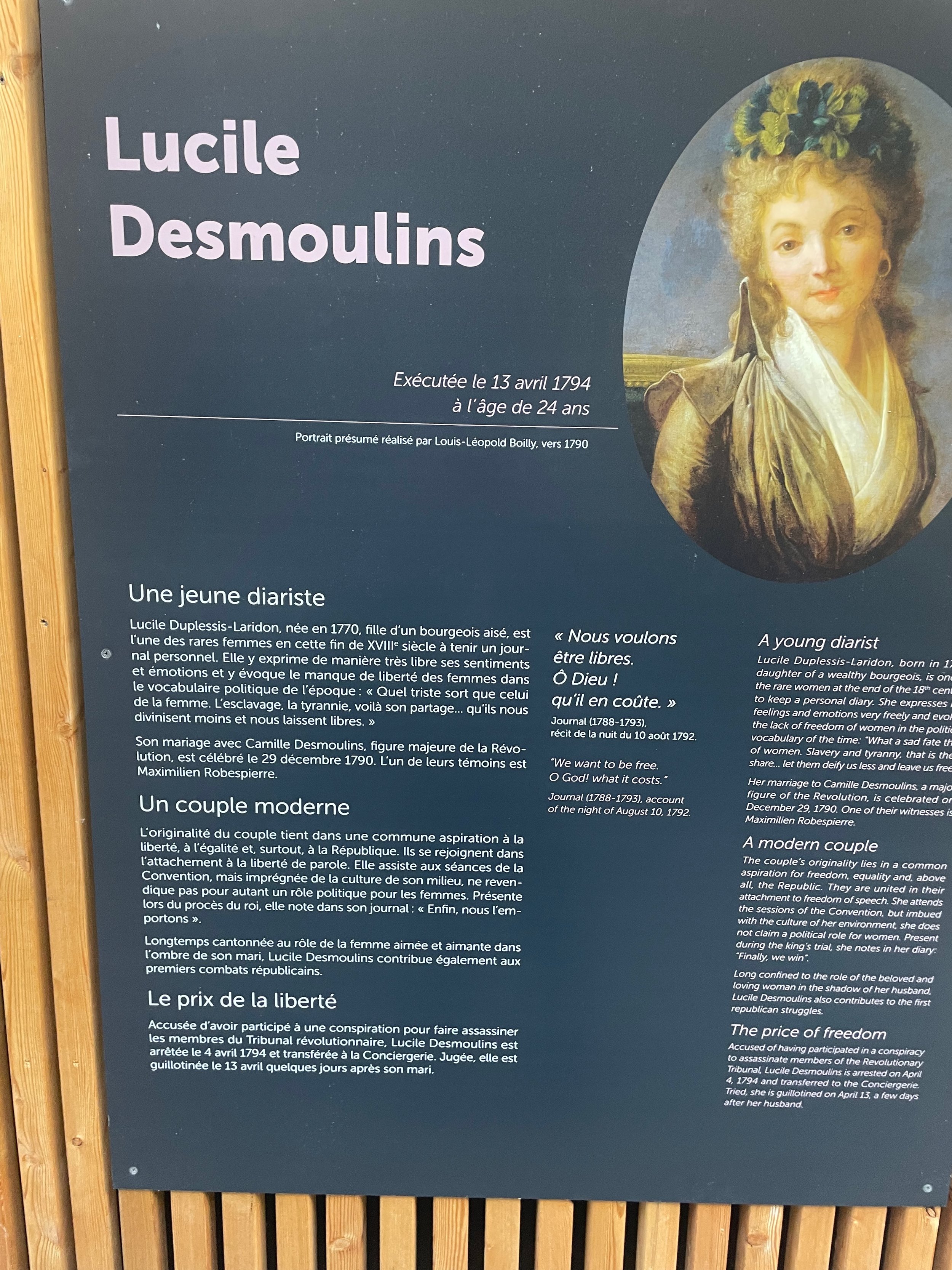 L’intérieur du musée est court à visiter, mais d’une belle élégance. Les tableaux et les salles sont une plongée dans l’histoire de Versailles avec des visages d’hommes et de femmes d’époque très parlants. J’aime particulièrement le portrait de Charlotte Corday, aux traits fins et au visage expressif, qui incarne très bien l’esprit révolutionnaire. Les salles arborant le roi et la reine pendant la Révolution sont glaçantes et montrent très bien la couleur de l’époque. Une époque à la fois terrifiante, mais aussi avec des idées porteuses. Les tableaux des autres époques nous rapprochent aussi des gens. La ville de Versailles est composée de tant de moments de la grande Histoire et de la petite histoire.